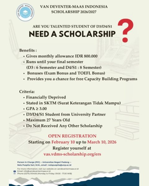 Open Registration since February 10 up to March 10, 2026 Duration of Support The scholarship starts from the 2nd Semester up to the standard duration of the study (S1/D4 = 2nd –
